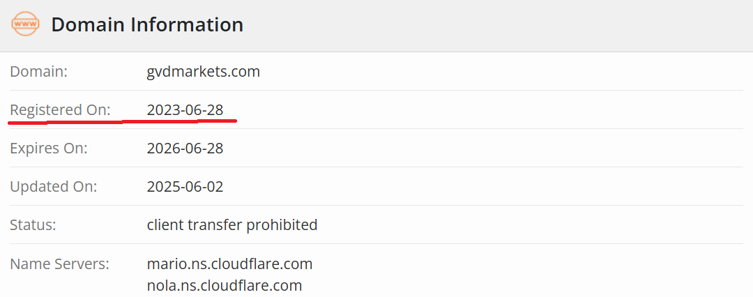 Regarding the company’s duration of existence: we see that it was registered and received its license on July 31, 2023. The operational domain, gvdmarkets.com, where the official website is hosted, appeared on June 28, 2023, almost a month before the official company registration. This aligns with a typical online broker launch roadmap: the website is finalized by the time approval from the registrar and regulator is obtained.