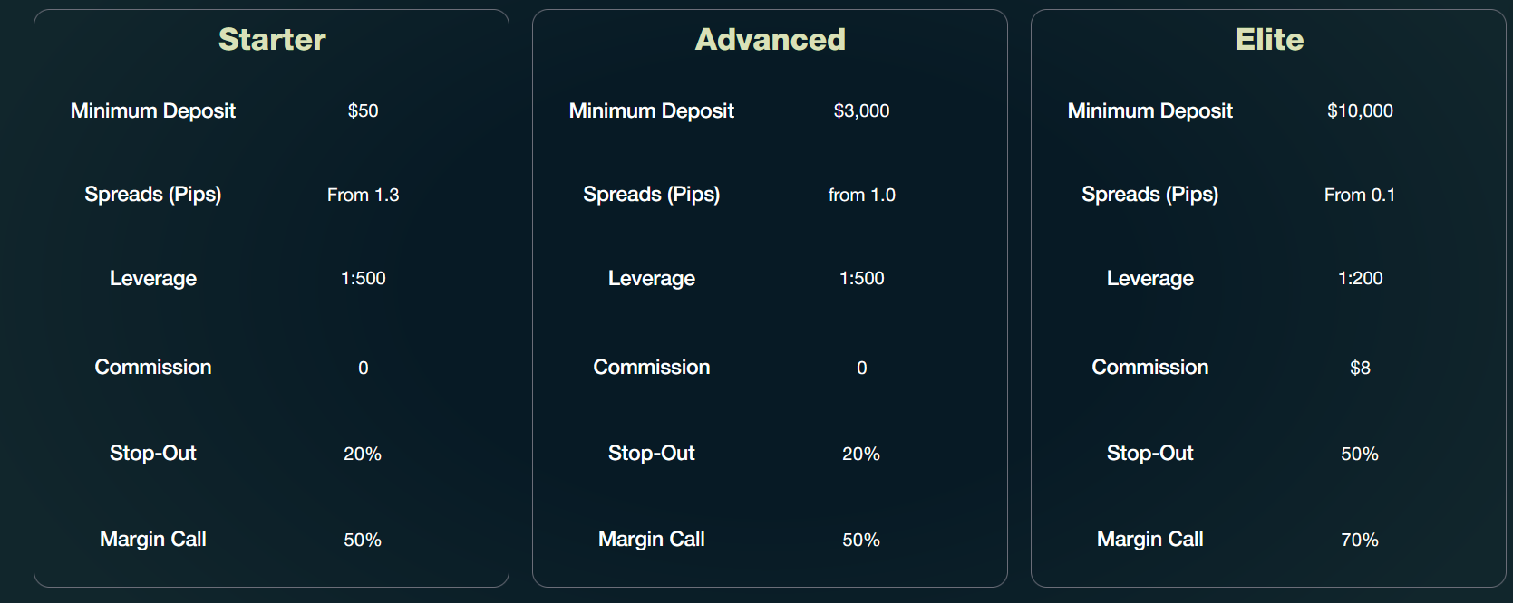 On the first two accounts, no trading commissions are charged, while the Margin Call/Stop Out levels are set at 40%/20%. On the Elite account, these protective thresholds are slightly higher at 70%/50%.